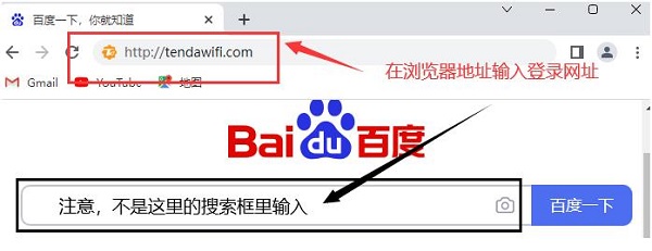 步骤二、打开任意浏览器(chrome/safari等),在地址栏中输入tendawifi.com或者192.168.0.1,点击转到进入登录界面。