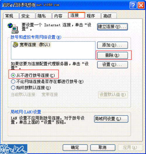 3、如果是拨号上网的用户,请先删除宽带的拨号连接,并选择"从不进行拨号连接"。点击浏览器里面的工具---Internet选项----连接,如下图: