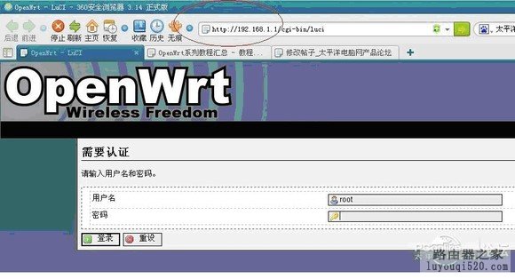首先登录无线路由的管理界面,方法为在浏览器输入192.168.1.1,如下图,帐号为root,密码是admin。