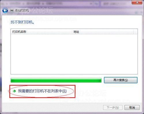 如果耐心地等待后系统还是找不到所需要的打印机也不要紧,也可以点击【我需要的打印机不在列表中】,然后点击【下一步】,如下图。