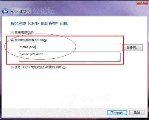 注意:如果此步操作中系统没有自动给出提示,那么很可能直接点击【下一步】会无法找到目标打印机,此时我们可以把“计算机名”用“IP”来替换,如下: