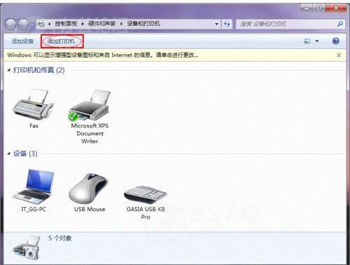 首先,无论使用哪种方法,都应先进入【控制面板】,打开【设备和打印机】窗口,并点击【添加打印机】,如下图: