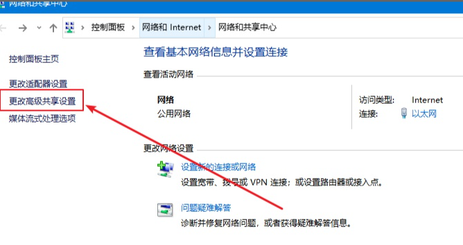 2、点击下面更改高级共享设置。