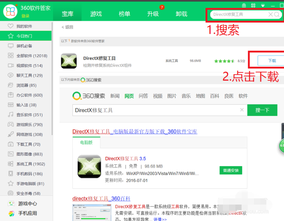 1、首先我们现在360软件管家搜索到directx修复工具,点击下载按钮。
