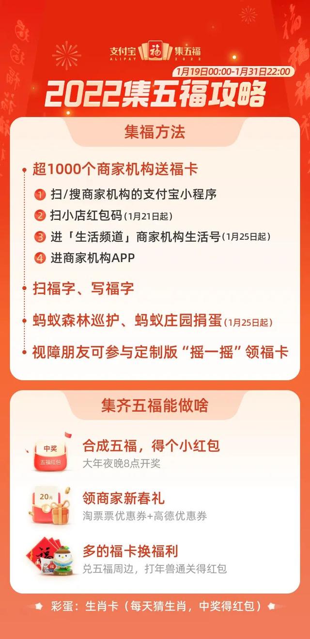 2022年的支付宝集五福将从1月19日零点正式开始,最终在除夕之夜也就是1月31日22点开奖,合成五福就可以“得个小红包”(官方原话)。