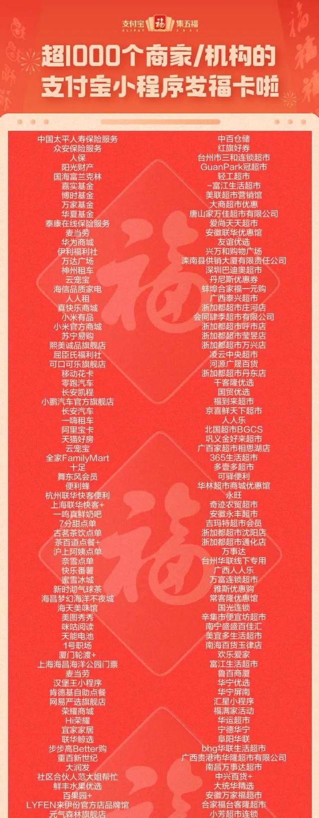 1000多个商家会通过自己的支付宝小程序、生活号、App等渠道为全国用户发福卡。在具体的操作方式上,用户可以通过线下扫码、上支付宝搜索进入商家机构的支付宝小程序,进入“生活频道”的商家生活号领取福卡。没有小程序和生活号的商家则可以通过红包码发福卡,路边摊、菜市场等小商家也将参与其中。