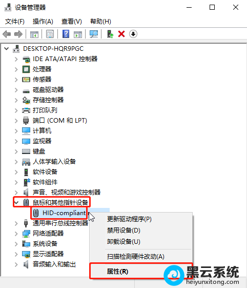 2.???????然后,在“设备管理器”窗口中,选择左侧的“鼠标和其他指针设备”,在展开列表中右键点击鼠标设备并在弹出菜单中选择“属性”