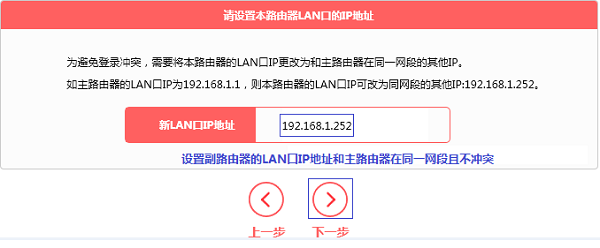 修改副路由器的LAN口IP地址和主路由在同一网段且不冲突,点击下一步,如下图。
