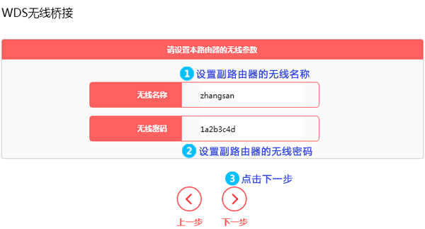 扫描并连接主路由器信号后,设置副路由器的无线网络名称和无线密码,并点击下一步,如下图: