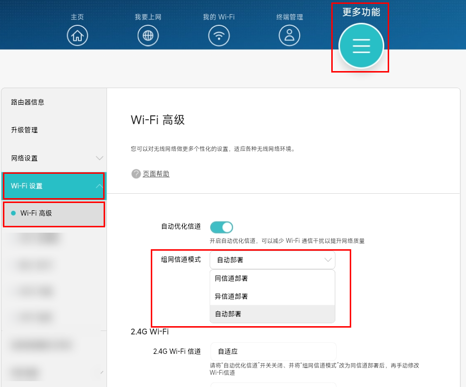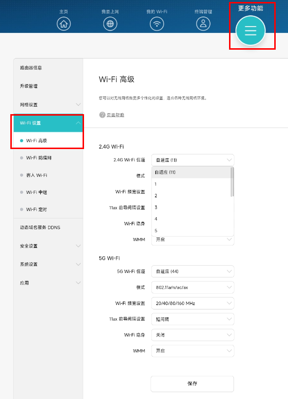 3. 点击更多功能>Wi-Fi 设置>Wi-Fi 高级,支持分别为 2.4GHz Wi-Fi 和 5GHz Wi-Fi 设置信道。您可以自行选择信道,也可以选择(不同路由器支持情况不同,请以实际为准):