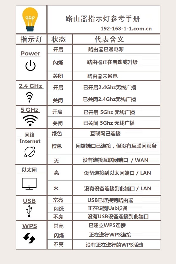 您的路由器灯应该是什么颜色?在正常情况下,您的路由器指示灯应保持稳定的绿色或白色。(电信、移动光猫信号指示灯怎么闪才是网络正常-->https://www.19216801.com.cn/baike/474.html)打开或重置路由器时,您应该会看到指示灯闪烁几分钟。如果您没有设备连接到路由器、未启用 WPS 或未插入 USB 设备,则这些图标上看不到灯是正常的。